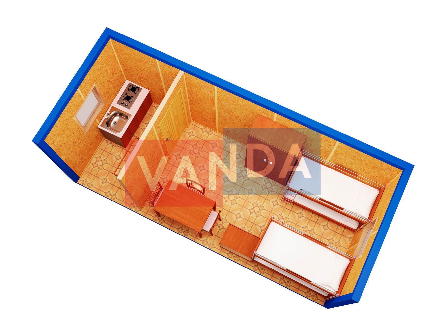 Блок контейнер металлический с кухней в тамбуре 5,85х2,4 изготавливается из несущего каркаса (верхняя и нижняя обвязка): швеллер 100х50х3 мм., угловые стойки: сложно - гнутый угол 90х90х3 мм., крыша блок-контейнера: металл сварной 0,9-1 мм., качественная наружная отделка: оцинкованный профлист, внутренняя отделка стен: Оргалит-ДВП, внутренняя отделка потолка: Оргалит-ДВП, вспомогательный деревянный каркас (стены): брусок 40х75 мм., лаги пола: обрезная доска 40х100 мм., лаги потолка: обрезная доска 40х100 мм., выполнено утепление: Минеральная вата «ISOVER» – 50 мм. и пароизоляция: плёнка техническая, черновой пол состоит из: обрезная доска 20 мм. (2 сорт), чистовой пол покрыт: ДСП строительное 16 мм., отделка пола выполнена из качественных материалов. Контейнер комплектуется окнами: деревянное, двойное остекление 800х1000, входной дверью: ДГ 21-8 обшита снаружи оцинкованным листом, врезной замок и внутренними дверями: ДГ 21-8 (при наличии перегородки). Если в БК присутствуют перегородки, то для них используется: брусок 40х50 мм.