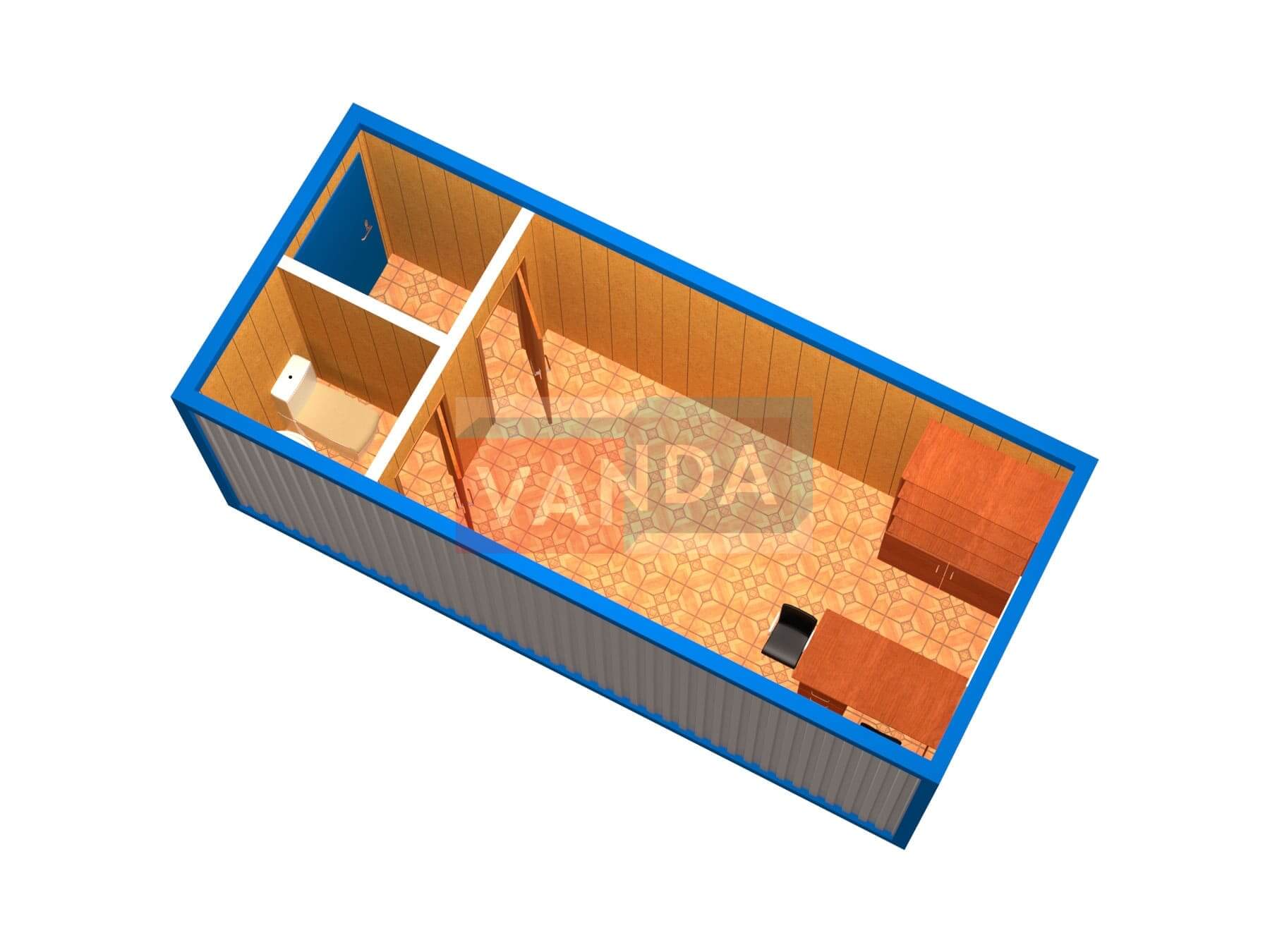 Офисный блок-контейнер с тамбуром и туалетом № 6 (вариант 2) изготавливается из несущего каркаса (верхняя и нижняя обвязка): швеллер 120х50х3 мм., угловые стойки: сложно - гнутый угол 90х90х3 мм., крыша блок-контейнера: металл сварной 0,9-1 мм., качественная наружная отделка: оцинкованный профлист, внутренняя отделка стен: Панели МДФ, внутренняя отделка потолка: Панели ПВХ, вспомогательный деревянный каркас (стены): брусок 40х75 мм., лаги пола: обрезная доска 40х100 мм., лаги потолка: обрезная доска 40х100 мм., выполнено утепление: Минеральная вата «ISOVER» – 100 мм. и пароизоляция: плёнка техническая, черновой пол состоит из: обрезная доска 20 мм. (2 сорт), чистовой пол покрыт: ДСП строительное 16 мм., отделка пола: линолеум полукоммерческий. Контейнер комплектуется окнами: ПВХ однокамерное, одностворчатое, п/о 900х1100, входной дверью: металлическая, утеплённая (Россия) и внутренними дверями: МДФ (при наличии перегородки). Если в БК присутствуют перегородки, то для них используется: брусок 40х50 мм.
