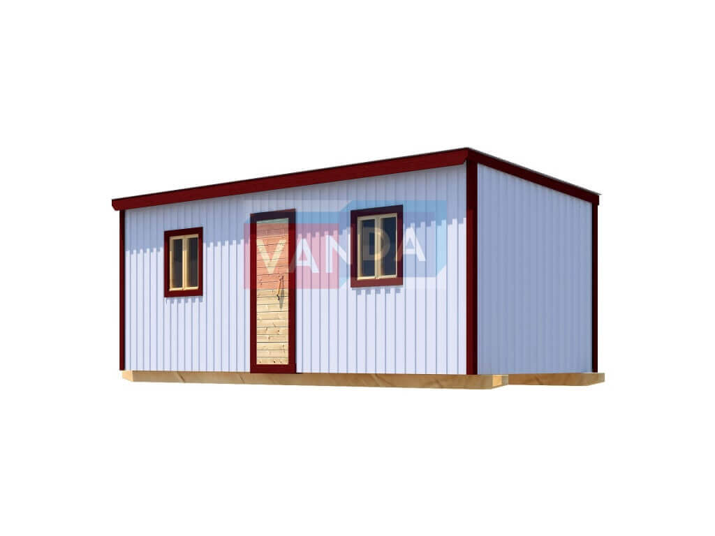 Строительная бытовка без внутренней отделки №8 (вариант 2) изготавливается из качественных материалов: обвязочный венец (сани): брус 100х150 мм., половые лаги: обрезная доска 40х150 мм., через 80 см. (плашмя), черновые полы: обрезная доска 20 мм. (2 сорт), (не сплошной настил, через 10 - 15 см.), чистовой пол покрыт: ДСП строительное 16 мм.. Для изготовления каркаса и перегородок используется: брусок 40х50 мм.. Для стропил используется: обрезная доска 40х150 мм., на кровлю ложится: оцинкованный профлист. Качественная наружная отделка: Профлист. Выполнено утепление полов: Минеральная вата «ISOVER» – 50 мм. и пароизоляция: плёнка техническая. Бытовка комплектуется окнами: деревянное, двустворчатое, одинарное остекление 800х800 мм., входной дверью: деревянная, наборная.