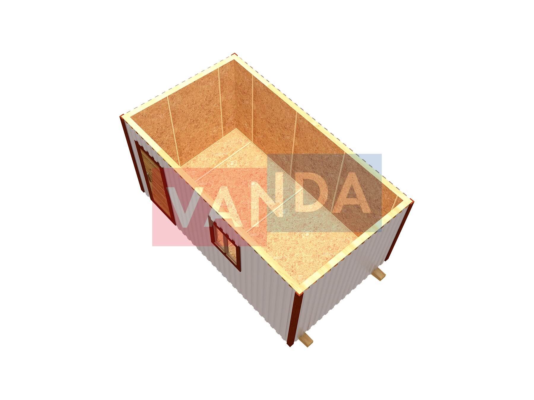 Зимняя бытовка утепленная №2 (вариант 2) изготавливается из качественных материалов: обвязочный венец (сани): брус 100х150 мм., половые лаги: обрезная доска 40х150 мм., через 80 см. (плашмя), черновые полы: обрезная доска 20 мм. (2 сорт), (не сплошной настил, через 10 - 15 см.), чистовой пол покрыт: ДСП строительное 16 мм.. Для изготовления каркаса и перегородок используется: брусок 40х50 мм.. Для стропил используется: обрезная доска 40х150 мм., на кровлю ложится: оцинкованный профлист. Качественная наружная отделка: Профлист, внутренняя отделка стен: Оргалит-ДВП, внутренняя отделка потолка: Оргалит-ДВП. Выполнено утепление: Минеральная вата «ISOVER» – 50 мм. и пароизоляция: плёнка техническая. Бытовка комплектуется окнами: деревянное, двустворчатое, одинарное остекление 800х800 мм., входной дверью: деревянная, наборная и внутренними дверями: деревянная, наборная (при наличии перегородки).