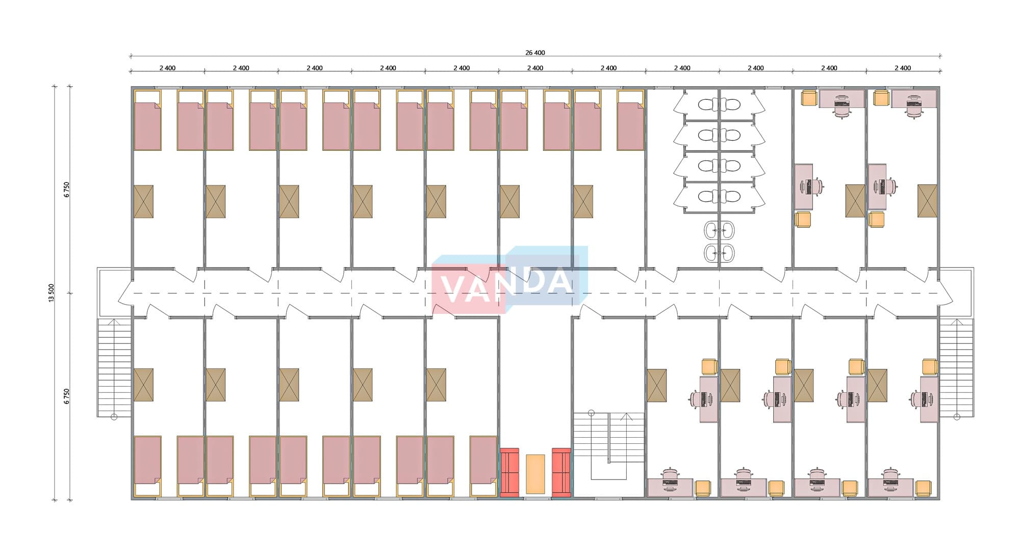 Проект общежития из блок контейнеров 9x21,6 Панели МДФ